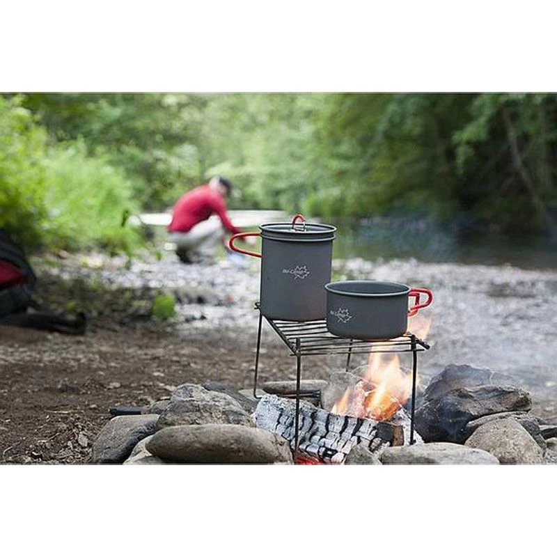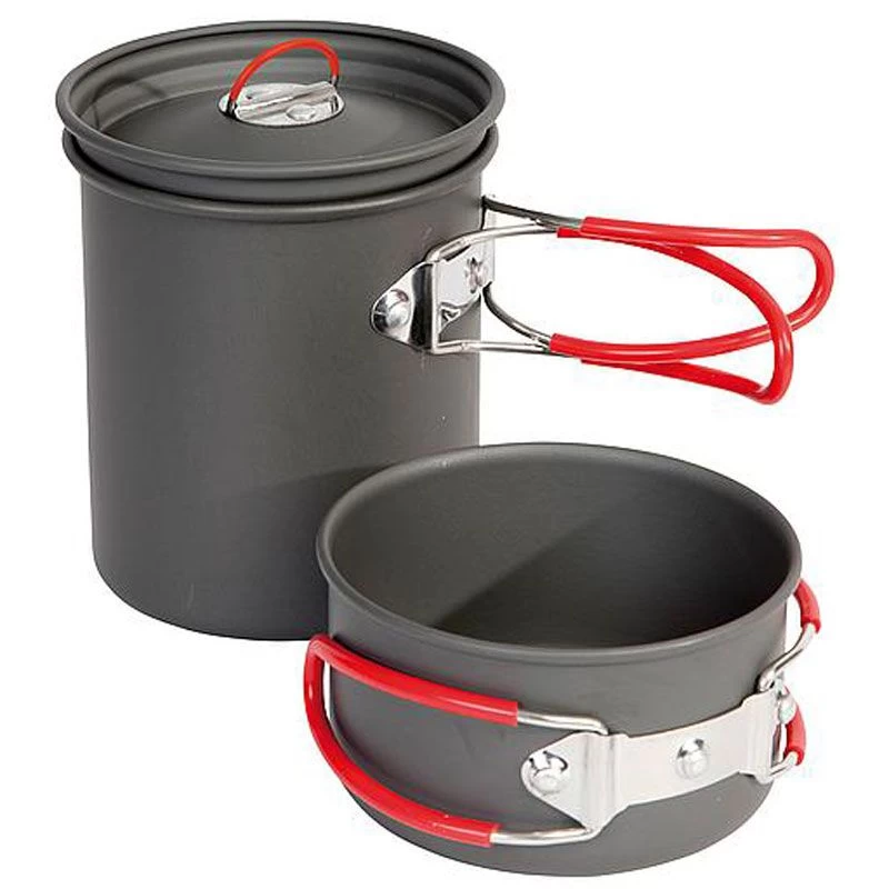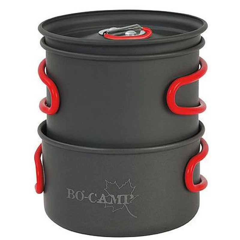 De lichtgewicht 2-delige pannenset van Bo-Camp bestaat uit 2 kookpannen met universele deksel. De siliconen handgrepen van de pannen zijn hittebestendig en inklapbaar. Dit product is ook geschikt voor benzinebranders. De pannen zijn gemaakt van aluminium en de handgrepen van de pannen zijn inklapbaar, zodat de pannenset na gebruik compact kan worden opgeborgen. Het product wordt geleverd inclusief foedraal. De pannen hebben een inhoud van 400 en 800 ml met een doorsnede van ø 105 en ø 135 mm.