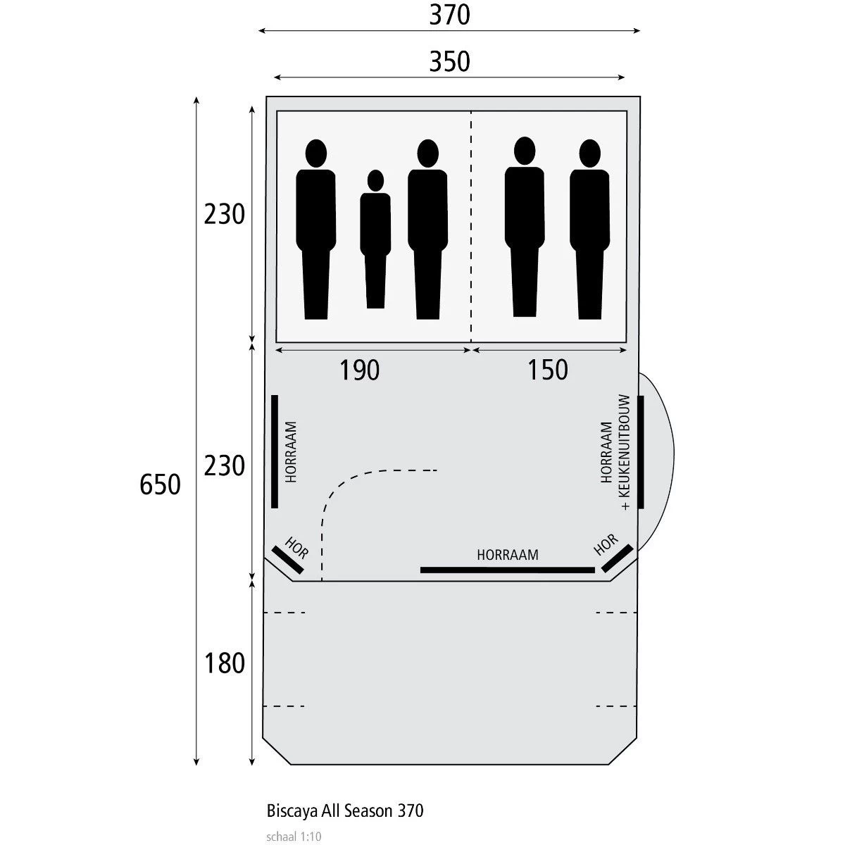 De Cabanon Biscaya 370 All Season tunneltent is een zeer ruime familietent voor 4 tot 5 personen met een royale luifel van 180 cm diep, extra lange slaapcabines en een grote leefruimte. De Biscaya tunneltent is gemaakt van Ten Cate All Season Residental tentdoek, een zeer duurzaam materiaal en eenvoudig schoon te maken.