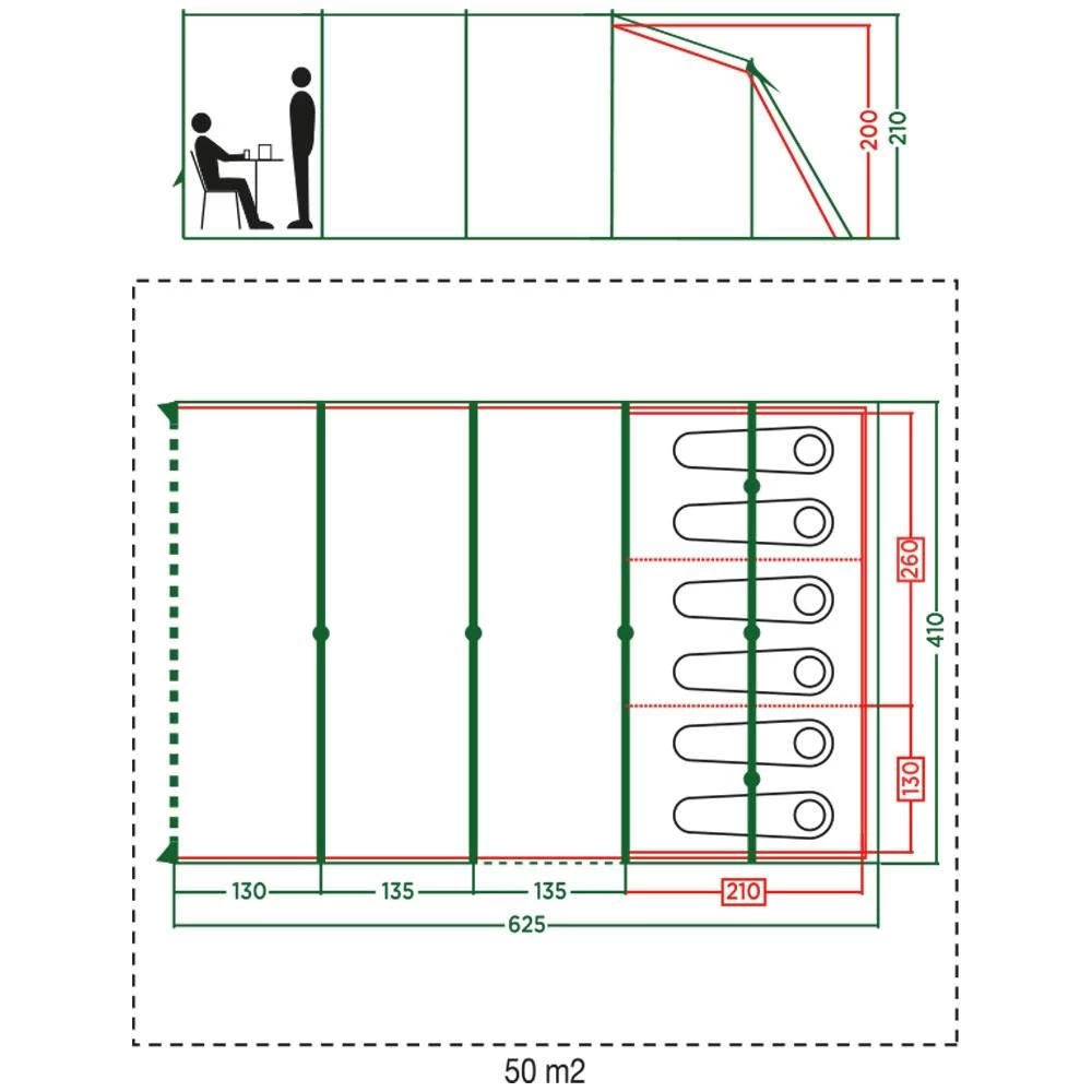 De tent is voorzien van extra grote slaapruimtes voor een goede nachtrust. De handige kabelopening in het tentdoek zorgt voor een gemakkelijke toegang tot de stroomvoorziening buiten de tent.