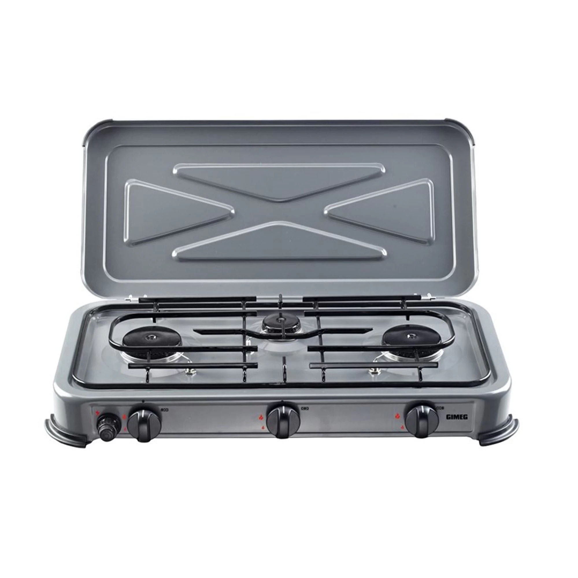 Dit grijze 3-pits kooktoestel van Gimeg is voorzien van twee krachtige 2,2 kilowatt branders voor een maximaal vermogen. Dit kooktoestel is eenvoudig te ontsteken dankzij de ingebouwde elektronische batterijontsteking. Dit product is veilig en stabiel dankzij de antislip voetjes. Bovendien heeft dit kooktoestel een deksel die ook kan dienen als windscherm voor tijdens het koken. Het product is eenvoudig schoon te maken dankzij de afneembare pannendrager en geëmailleerde onderdelen.