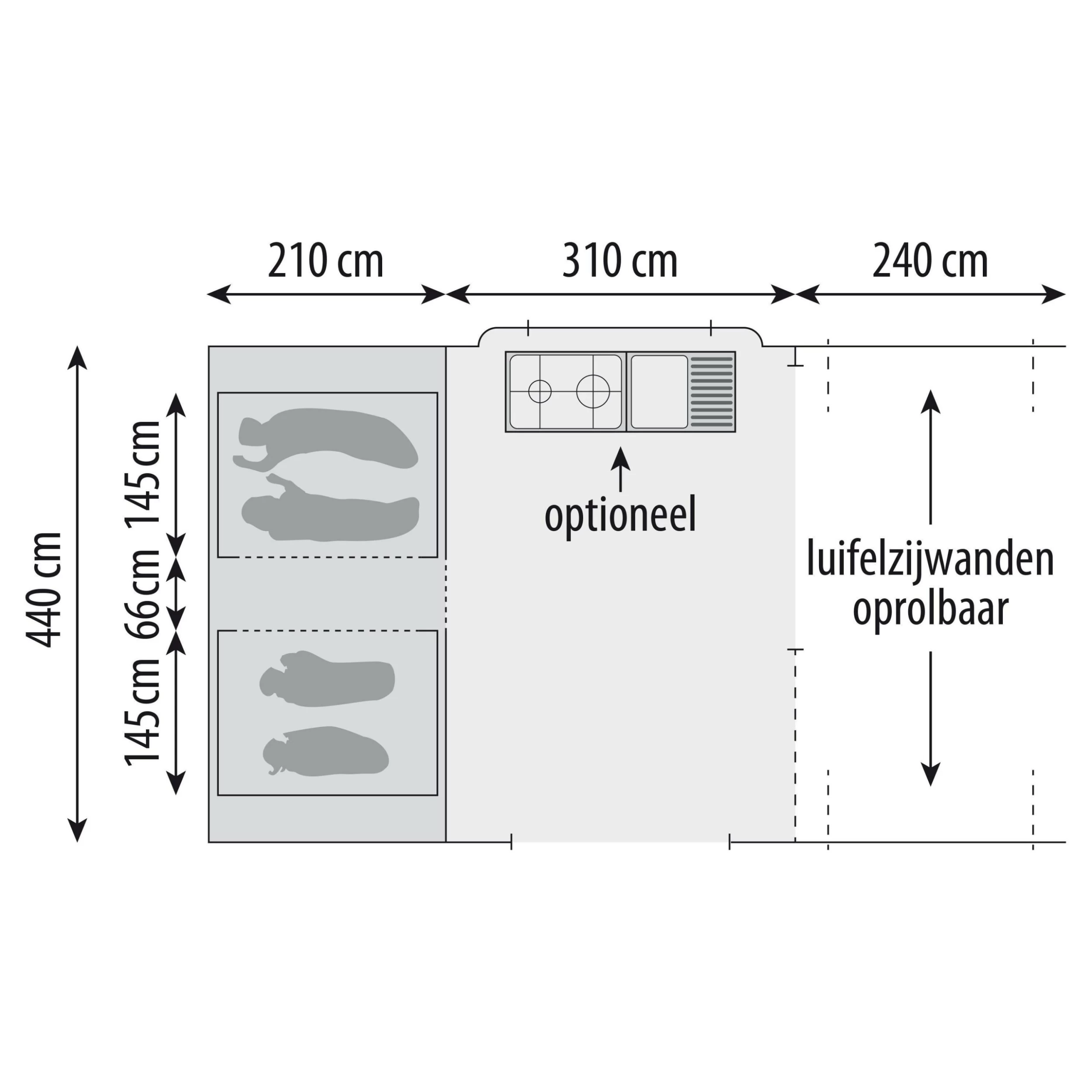 De slaapruimtes van de Sunrider vouwwagen zijn gericht op een heerlijke nachtrust. Er zijn in totaal 4 slaapruimtes die ieder plek bieden voor twee personen. De slaapcabines hebben een lengte van 210 centimeter bij 145 centimeter. De bedden zijn voorzien van luxe matrassen en lattenbodems. Dankzij de donkere inritsbare slaapcabines blijft het lekker lang donker in de slaapruimtes. De wagentent is ook los opzetbaar wanneer u slechts 1 overnachting hebt. Tussen de slaapruimtes is een afsluitbare legkast geplaatst waarin u uw waardevolle spullen veilig kunt opbergen.