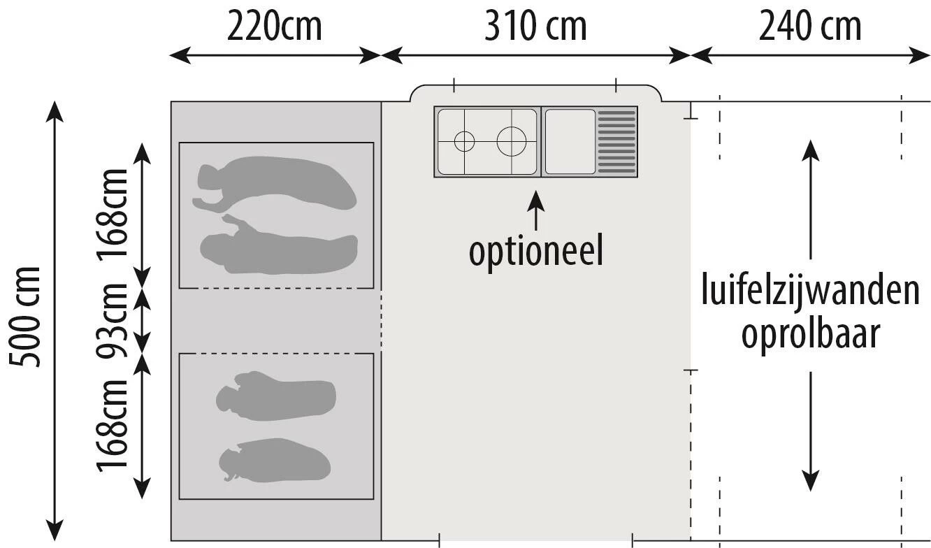 Om in de schaduw te kunnen zitten of te schuilen voor regen, heeft de vouwwagen een vast luifel van bijna 2,5 meter diep. De zijwand is oprolbaar en heeft afsluitbare ramen. Blijft u ergens maar één nacht overnachten? Geen probleem, u kunt ook alleen de wagentent opzetten. Dat maakt de Europa Camper Sunrider XL Deluxe vouwwagen ideaal voor een reis met meerdere tussenstops.