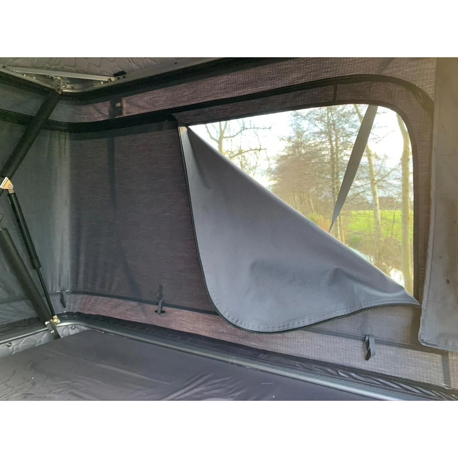 De daktent is voorzien van twee grote ramen aan het hoofd- en voeten einde. Verder is de tent uitgerust met twee deuren. Bij zowel de deuren als ramen is er zeer fijn muggengaas in verwerkt, waardoor insecten op afstand blijven. Wanneer u een raam of deur te allen tijde op een kiertje laat staan kunt u profiteren van permanente ventilatie.