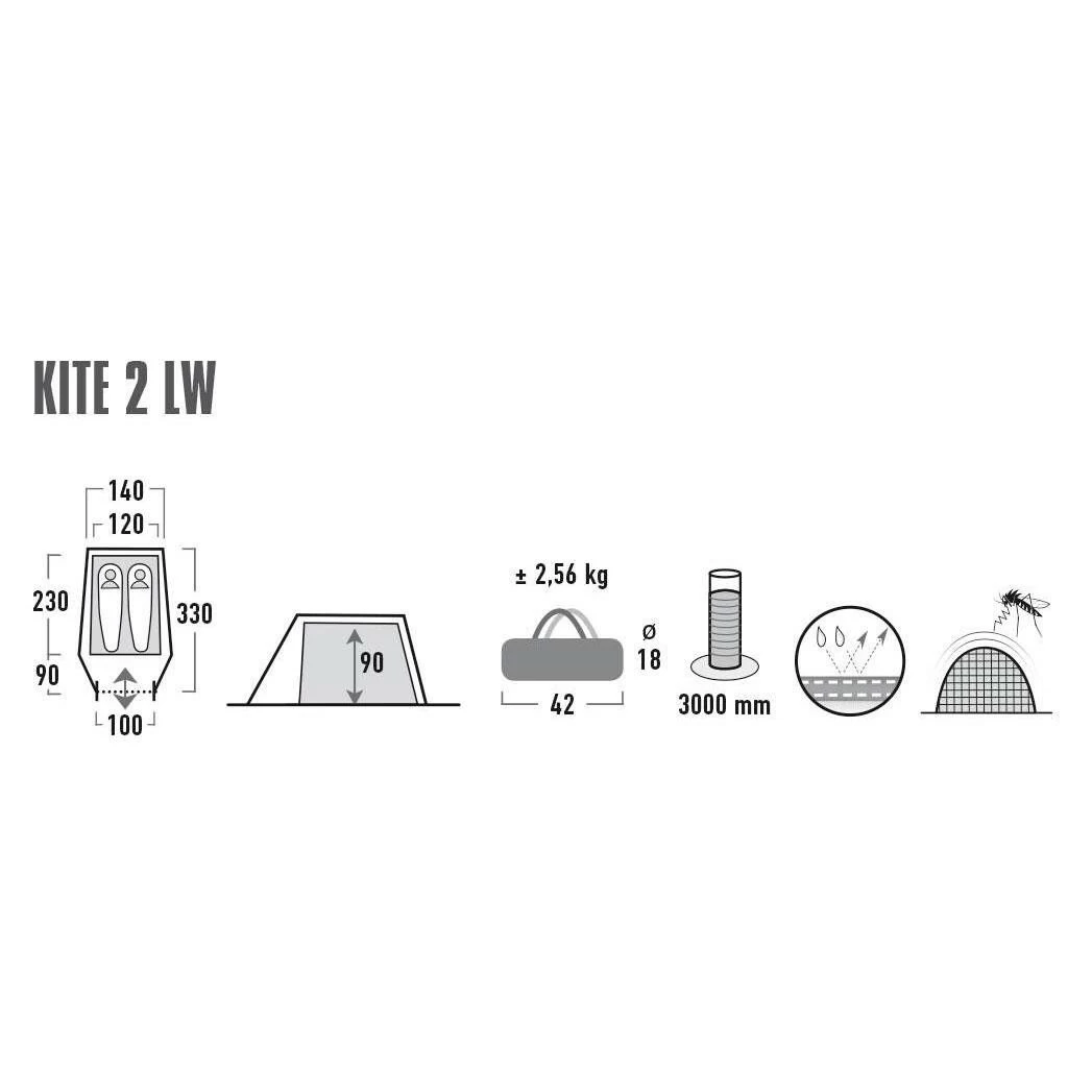 De High Peak Kite 2 LW is een snel op te zetten, lichtgewicht tunneltent. Deze trekkerstent weegt maar 2,5 kg. In het voorste deel van de tent is een vast grondzeil aanwezig. De toegang tot de binnentent is uitgevoerd met horrengaas. De binnentent zit al aan de buitentent vast en opzetten is dan ook heel eenvoudig.