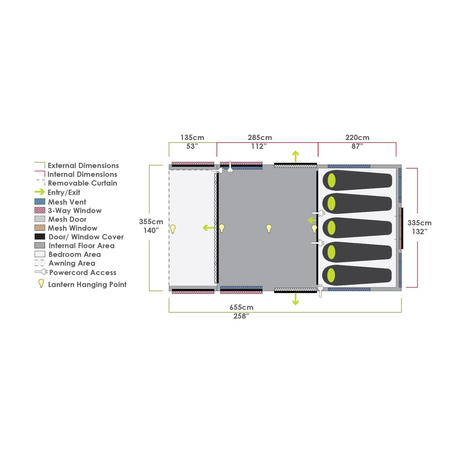 In deze familietent zijn drie slaapcabines aanwezig, waarvan een grote cabine kan worden gemaakt door de scheidingswandjes weg te rollen.